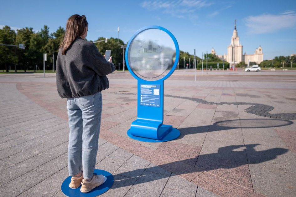 На смотровой площадке Воробьевых гор установлена информационная стела, которая поможет ознакомиться с 3D-панорамой прямо на месте. Чтобы ее увидеть, нужно отсканировать куар-код и скачать приложение «Узнай Москву». После установки приложения необходимо отсканировать куар-код еще раз, нажать кнопку «Посмотреть 3D-панораму» и выбрать интересующий период времени. Затем можно осмотреть все вокруг через камеру смартфона — исторические виды оживут прямо на экране.